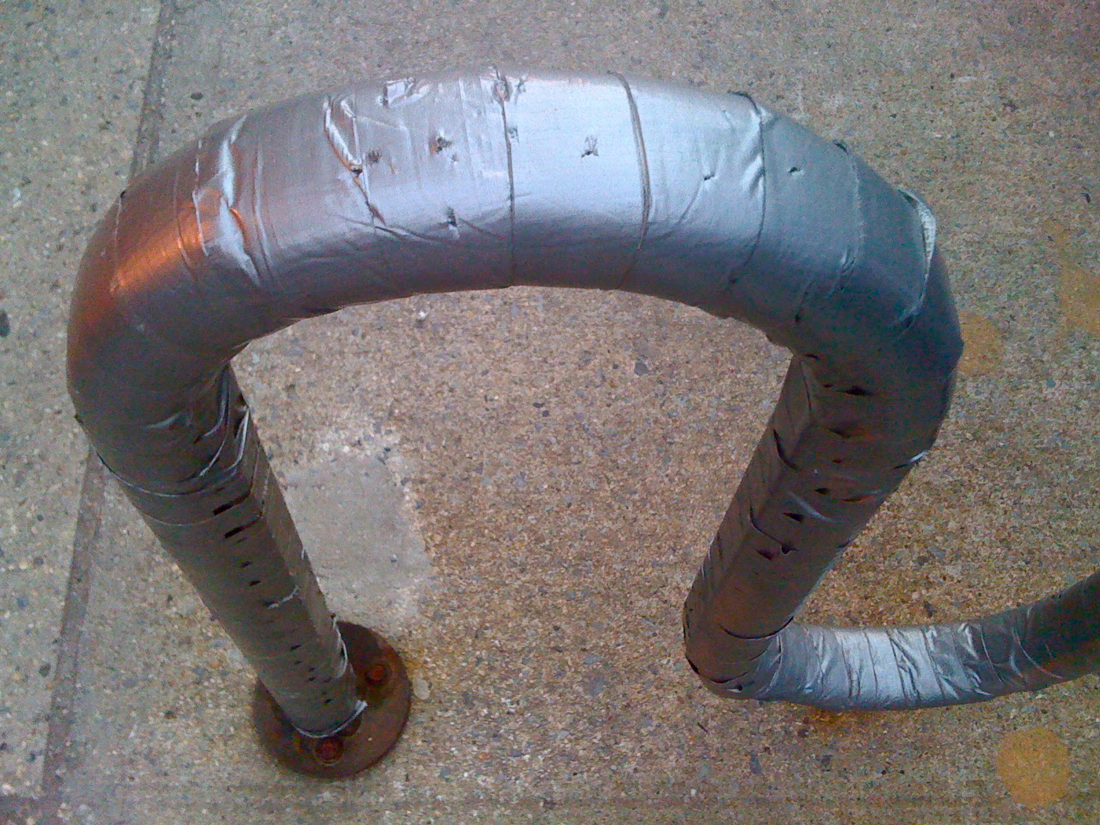 One solution to preventing nicks and scratches -- came across this bike rack wrapped in foam and duct tape in Park Slope, Brooklyn.